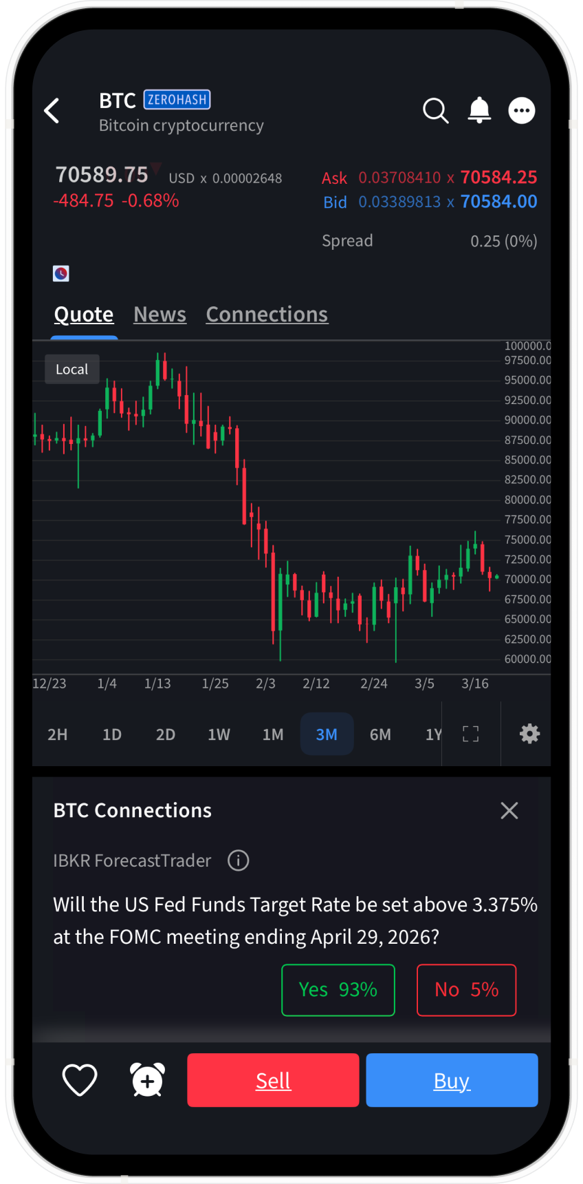 要购买加密货币,请在可信赖的加密货币交易所或提供加密货币访问权限的在线经纪商(如盈透证券)开设账户。账户开设并注资后,您可能需要申请加密货币和虚拟资产产品的交易权限。选择要购买的加密货币,输入您希望投资的金额,查看佣金和费用,然后下单。